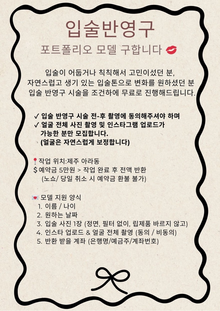 [아라동] 7월 6,7,8일 입술모델 모집❤️ 페이지 정보 작성자 겨리 작성일25-06-27 16:52 조회1,007회 연락처 010-2230-6689 급여 협의 : 0 관련링크 본문 7월 6일 1명7월 7일 1명7월 8일 1명40만원 상당의 입술 작업 조건하에 무료로 작업해드립니다.지원양식 작성하여 문자로 보내주세요.더 많은 사진은 인스타그램 @gonggan_beauty 주소 : 제주시 인다5길 11-8 이전글 다음글 목록