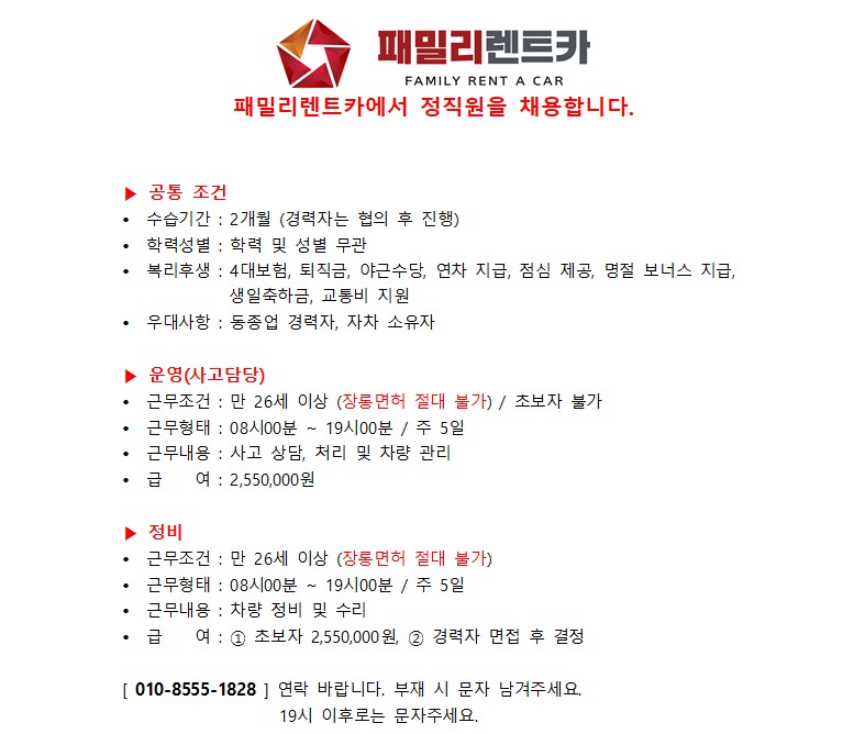 패밀리렌트카 정직원 채용 페이지 정보 작성자 패OOOO카 작성일25-06-12 09:18 조회1,123회 연락처 010-8555-1828 급여 월급 : 255만 관련링크 본문 연락주세요 주소 : 제주특별자치도 제주시 제성1길 67 이전글 다음글 목록