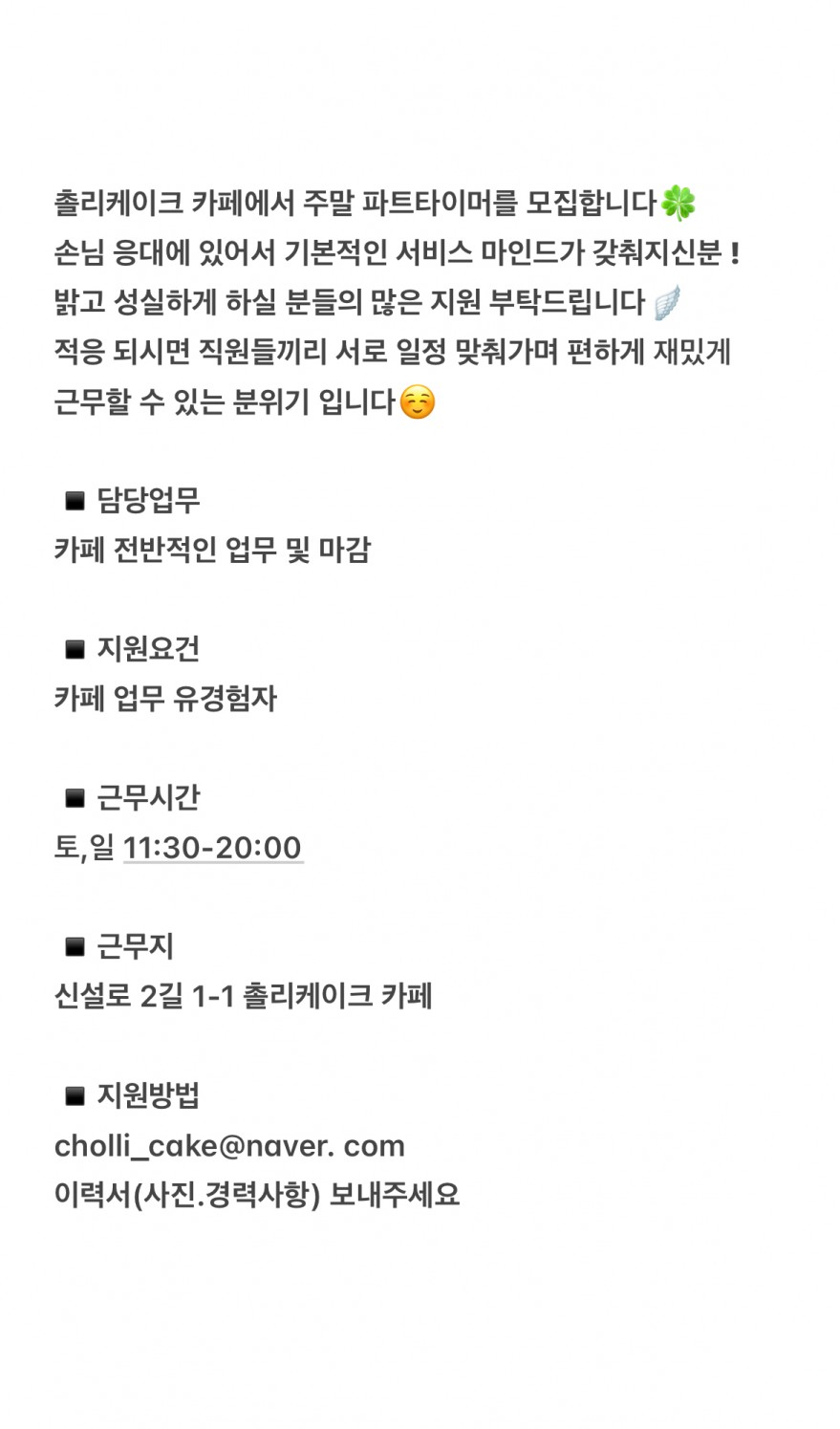 촐리케이크 주말 풀타임 파트타이머 구합니다 페이지 정보 작성자 cOOOOe 작성일25-06-10 21:49 조회1,467회 연락처 010-000-000 급여 시급 : 11,000 관련링크 본문 주소 : 신설로2길1-1 이전글 다음글 목록