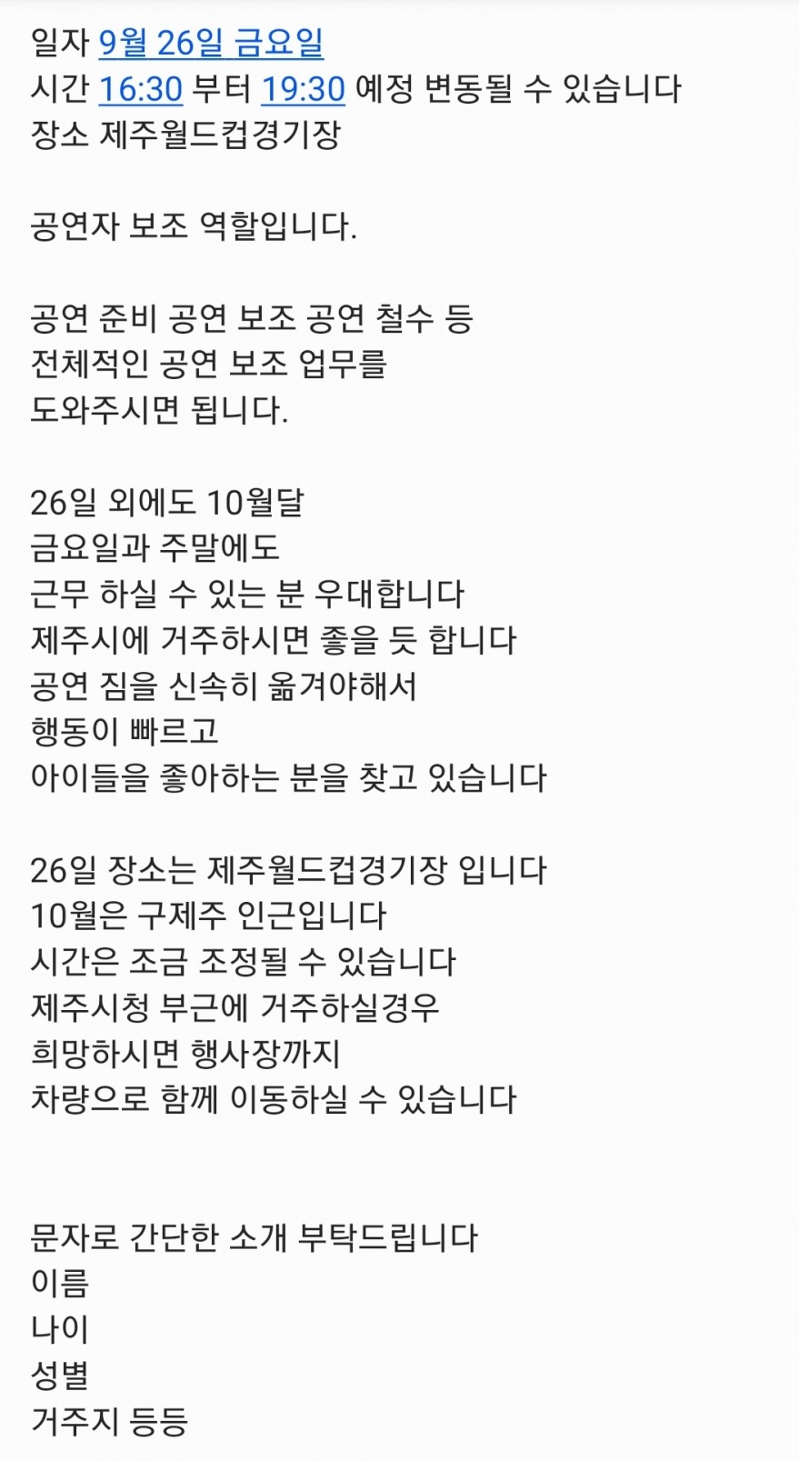 축제행사공연보조구합니다 페이지 정보 작성자 프O르 작성일25-09-24 19:34 조회398회 연락처 010-8180-2369 급여 시급 : 12000 관련링크 본문 000 주소 : 제주특별자치도 제주시 광양9길 10 제주시청 이전글 다음글 목록