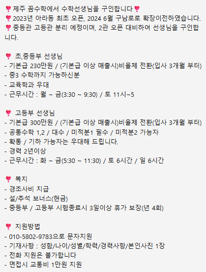 수학 학원에서 선생님을 모십니다. 페이지 정보 작성자 김환 작성일25-09-24 19:49 조회263회 연락처 010-5802-9783 급여 협의 : N 관련링크 본문 주소 : 제주특별자치도 제주시 구남로7길 13-7 3층 이전글 다음글 목록