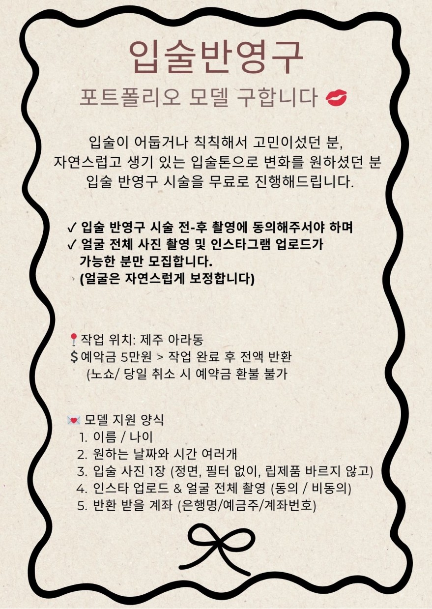 ❤️아라동❤️입술반영구 모델 모집❤️ 페이지 정보 작성자 겨리 작성일25-05-30 12:14 조회1,129회 연락처 010-2230-6689 급여 협의 : 0 관련링크 본문 작업사진은 인스타 @gonggan__beauty 지원양식 작성해서 문자로 부탁드려요~ 주소 : 제주시 인다5길 11-8 이전글 다음글 목록