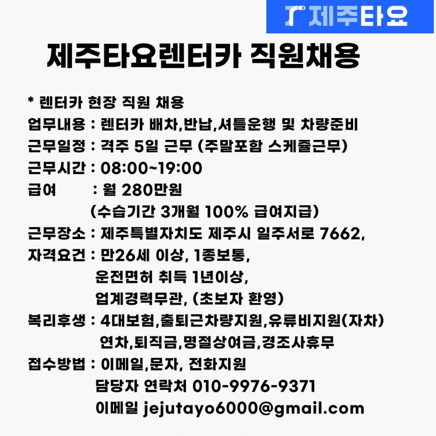 제주타요렌트카 직원구인 페이지 정보 작성자 구인 작성일25-05-28 14:00 조회1,266회 연락처 010-9976-9371 급여 월급 : 2800000 관련링크 본문 담당자 연락처 9976-9371이메일 jejutayo6000@gmail.com 주소 : 제주특별자치도 제주시 일주서로 7662 이전글 다음글 목록