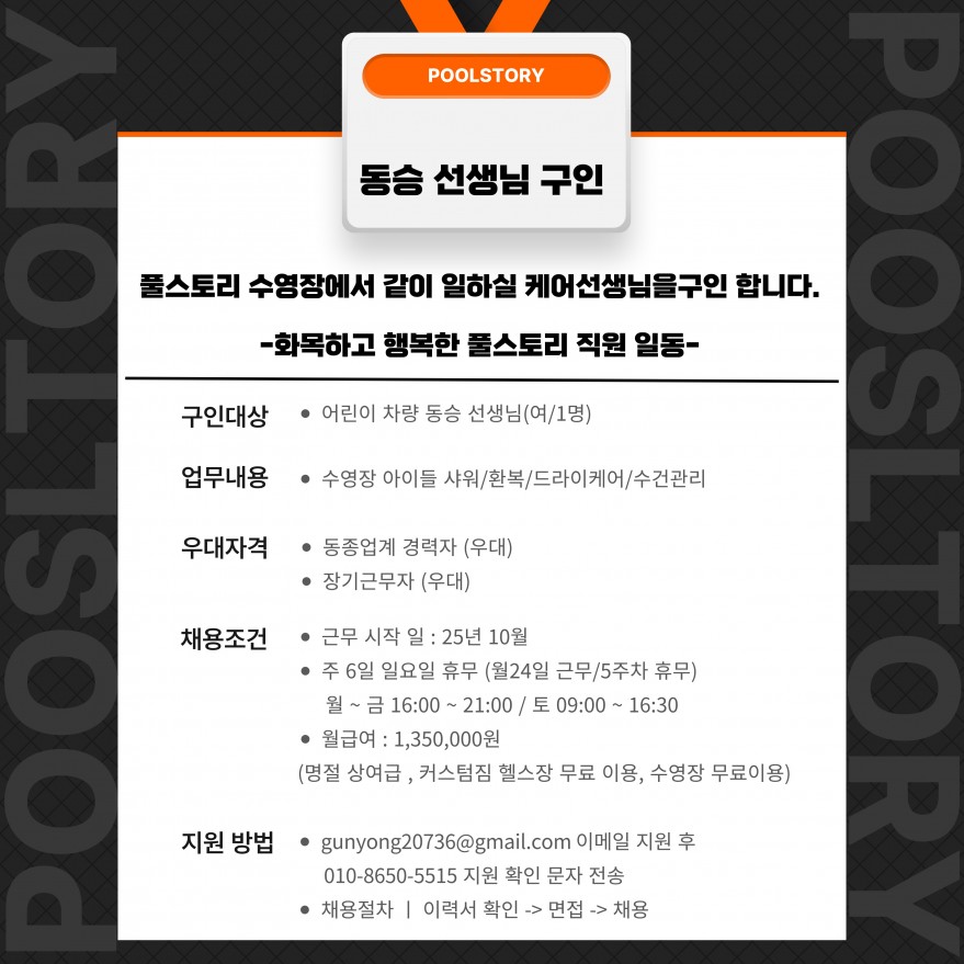 수영장 차량 동승/케어 선생님 구인 페이지 정보 작성자 pOOOOOOOy 작성일25-09-24 11:55 조회272회 연락처 010-8650-5515 급여 월급 : 1350000 관련링크 본문 풀스토리 수영장 차량 동승 케어 선생님 구인 근무시간 사진 참조 많은 관심 부탁드립니다^^ 주소 : 제주특별자치도 제주시 연사6길 57 지하1층 풀스토리수영장 이전글 다음글 목록