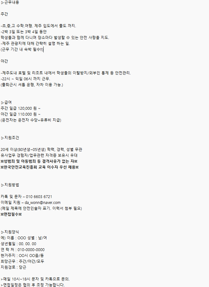 10월 단기 주간 안전지도사 모집. 페이지 정보 작성자 dOOOOOO원 작성일25-09-23 14:04 조회220회 연락처 010-6603-6721 급여 일당 : 120,000 관련링크 본문 . 주소 : 제주특별자치도 제주시 삼무로 15 연동태홍누리안3차아파트 제주시 삼무로 15 연동태홍누리안3차아파트 연동태홍누리안3차아파트 204호 이전글 다음글 목록