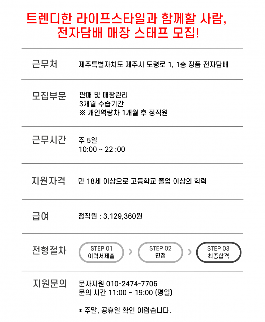♥︎♥︎내일 출근하기 딱 좋은 직장—전자담배 전문점 직원 구함♥︎♥︎ 페이지 정보 작성자 아OOO우 작성일25-11-20 18:07 조회74회 연락처 010-2474-7706 급여 월급 : 3,129,360 관련링크 본문 부재 시 문자로 이력서 보내주세요부재 시 문자로 이력서 보내주세요 주소 : 제주특별자치도 제주시 도령로 1 1층 전자담배 이전글 다음글 목록