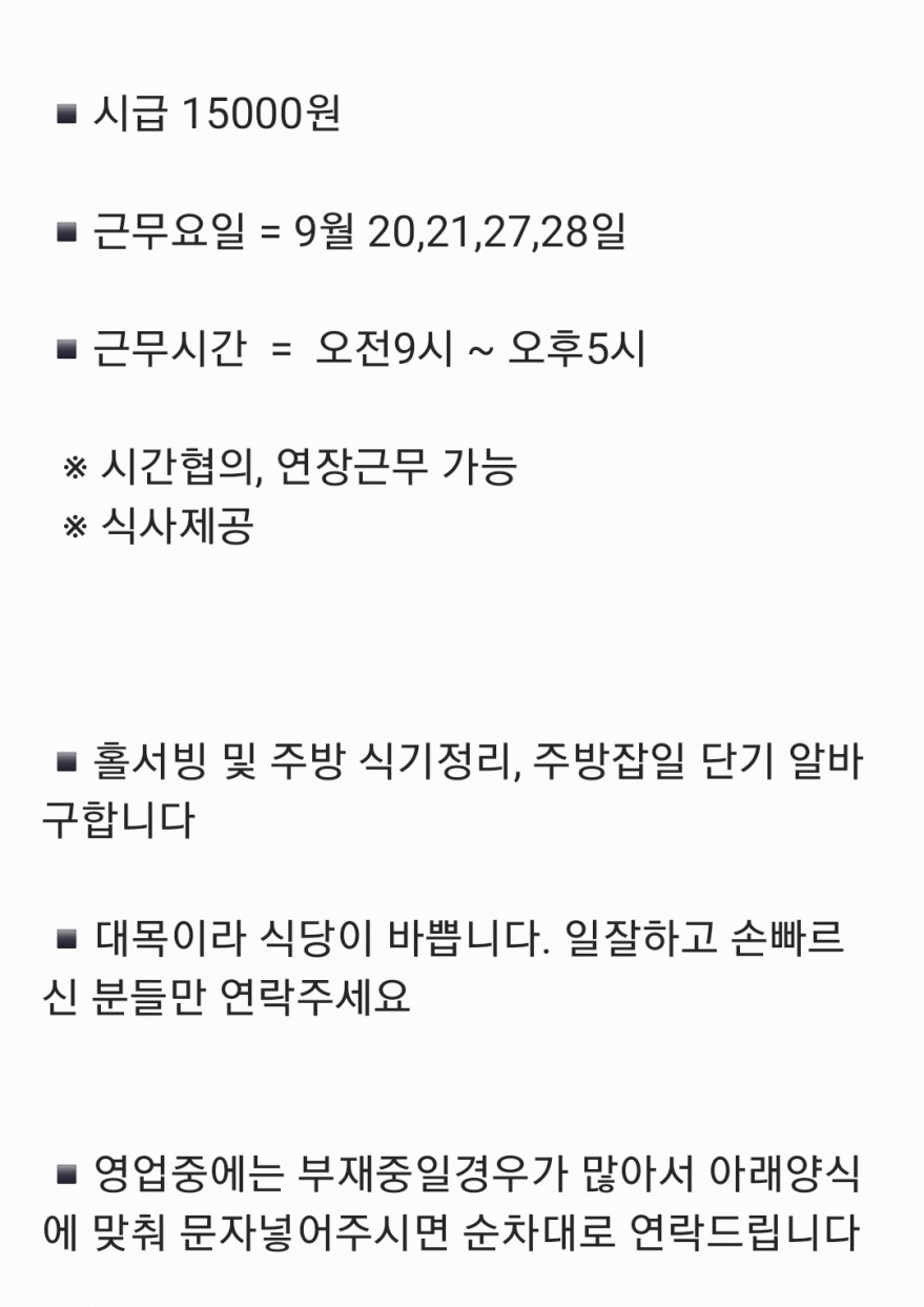 식당단기파트타임[홀서빙,주방(잡일)] 페이지 정보 작성자 pOOOOO5 작성일25-09-14 06:20 조회417회 연락처 010-4735-0155 급여 시급 : 15000원 관련링크 본문 . 주소 : 천덕로440-1 이전글 다음글 목록