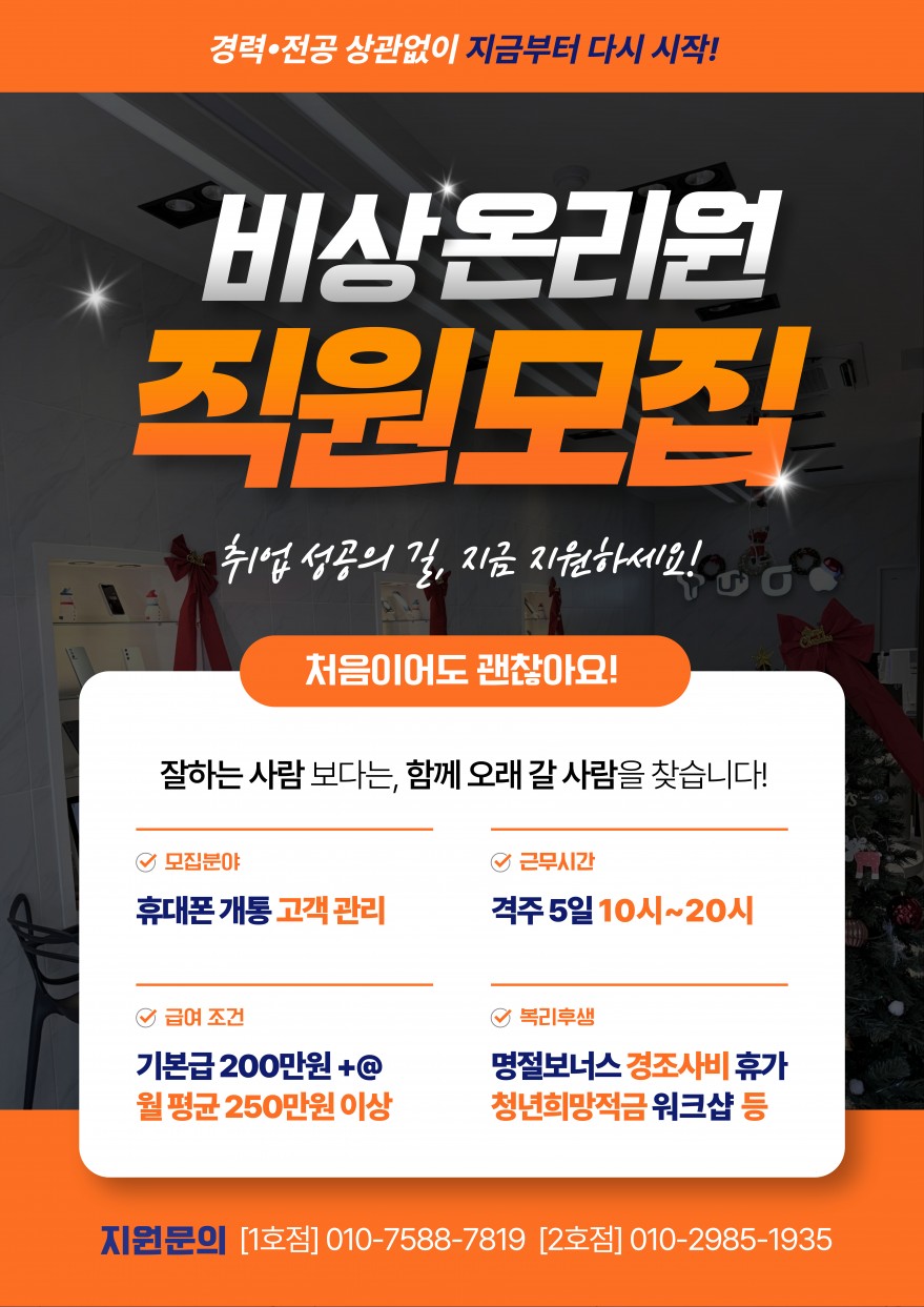 통신3사휴대폰매장⭐️비상!OnlyOne⭐️직원급구!!! 페이지 정보 작성자 아O라 작성일25-12-29 16:07 조회142회 연락처 010-7588-7819 급여 월급 : 250만원 이상 관련링크 본문 - 주소 : 제주 제주시 월랑로 8길 1 이전글 다음글 목록