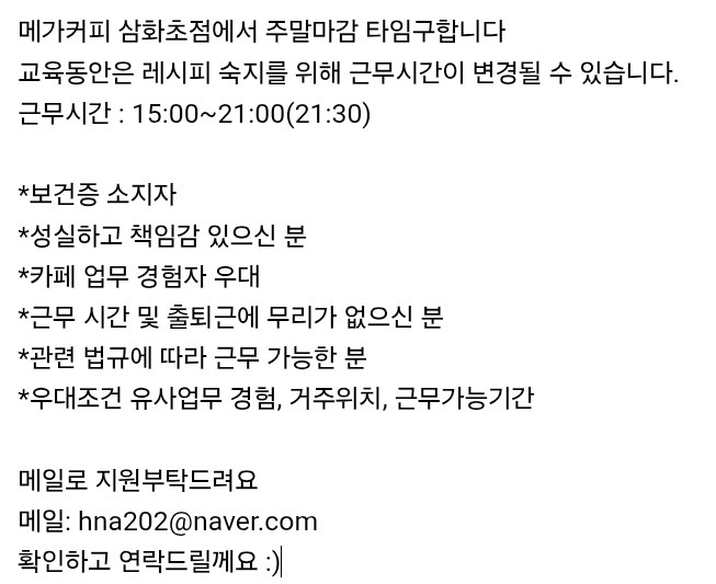 메가삼화초점주말마감모집합니다 페이지 정보 작성자 돌굴 작성일25-12-29 11:09 조회224회 연락처 010-7170-3336 급여 시급 : 10030 관련링크 본문 메가삼화초점주말마감모집합니다. 주소 : 제주시 화삼로19 삼화빌딩 1층 메가커피 삼화초점 이전글 다음글 목록