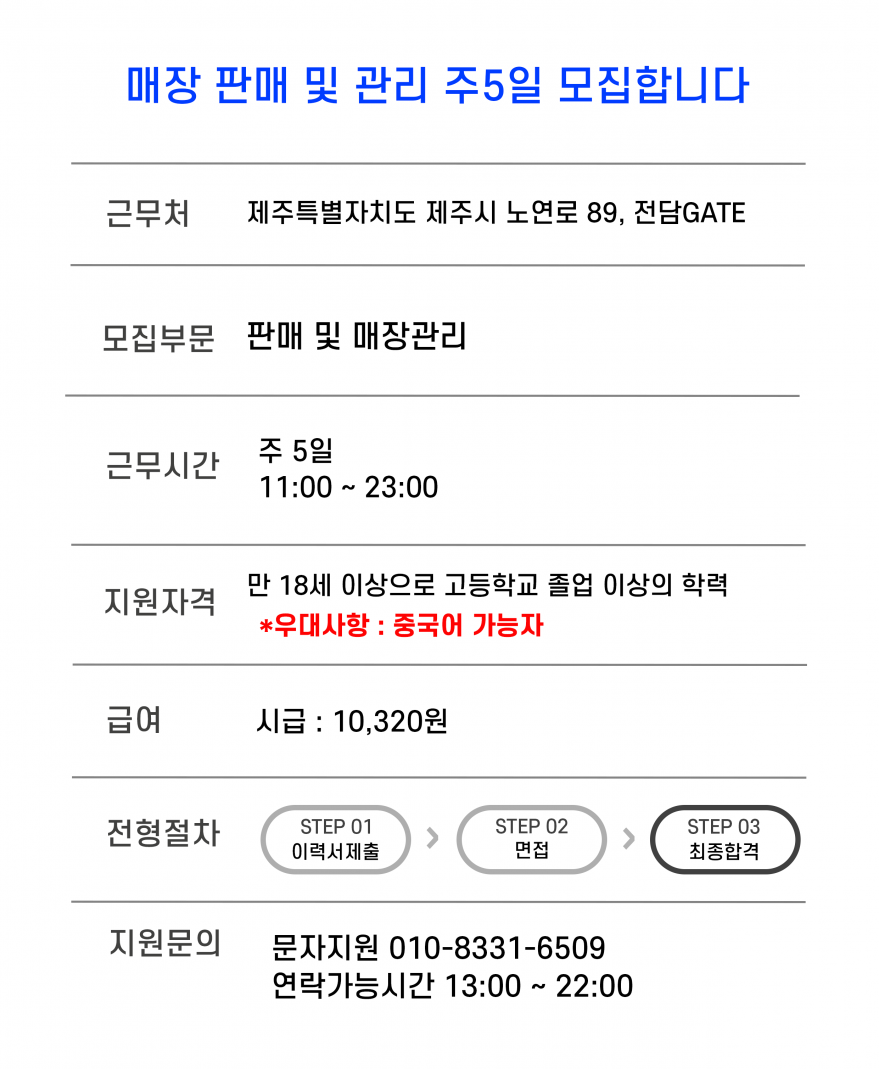 ★★★ 세상에서 제일 쉬운 판매직 직원을 모집합니다 ★★★ 페이지 정보 작성자 곽O식 작성일25-11-26 18:04 조회74회 연락처 010-8331-6509 급여 시급 : 10,320 관련링크 본문 ■ 주업무 : 고객이 물건 선택하면 결제 후 봉투에 담아드리기. 외워야 할 내용 거의 없음. ■ 근무지 : 연동 주소 : 제주특별자치도 제주시 노연로 89 1층 전담GATE 이전글 다음글 목록