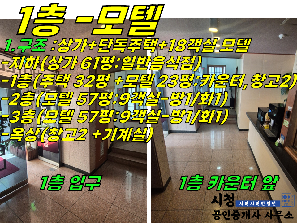 -1층 :주택 32평(방3 +화1 +주방 +거실) +모텔 23평(프론트 방1, 창고 2개, 화장실1)