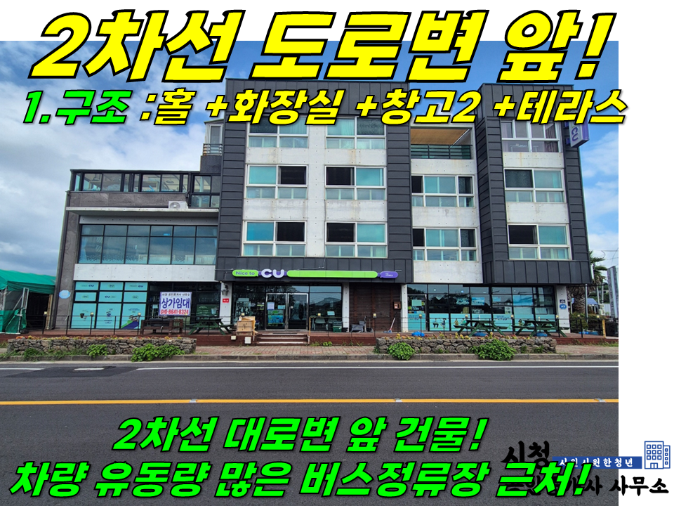 2. 일주도로에서 예래동, 대평리를 잇는 메인 도로에 접한 상가로, 차량 통행량 많고, 버스정류장도 도보 1분 이내 거리에 있는 2차선 도로변에 접한 상가입니다!