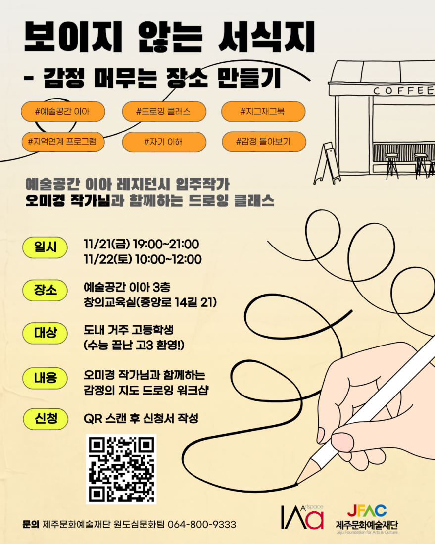 기타 | 예술공간_이아_지역연계_프로그램<보이지_않는_서식지-감정_머무는_장소_만들기>드로잉_클래스_참여자_모집 페이지 정보 작성자 이바 작성일25-11-15 11:22 조회1회 연락처 010-000-0000 관련링크 본문 세부사항홈페이지참고https://www.jfac.kr/notification/notice/19589?page=1 다음글 목록
