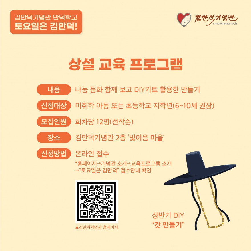 * 김만덕기념관 홈페이지 > 기념관 소개 > 교육프로그램 소개> "토요일은 김만덕" 접수안내 확인!