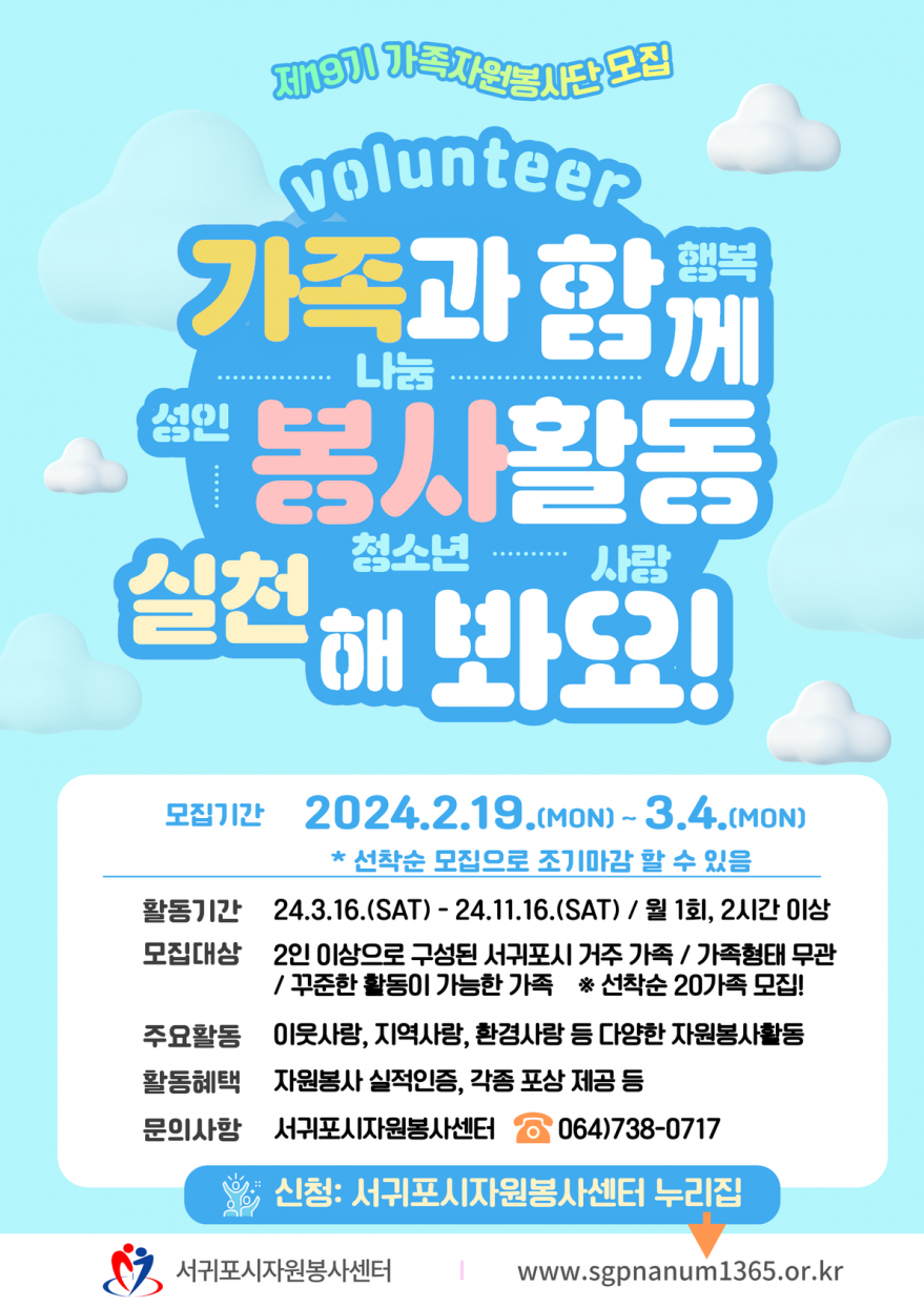 기타 | 제19기 가족자원봉사단 모집 페이지 정보 작성자 서OOOOOOOO터 작성일24-02-21 10:50 조회6,383회 연락처 010-738-0717 관련링크 본문 서귀포시자원봉사센터에서'제19기 가족자원봉사단'을 모집합니다!많은 참여 부탁드립니다! 이전글 다음글 목록