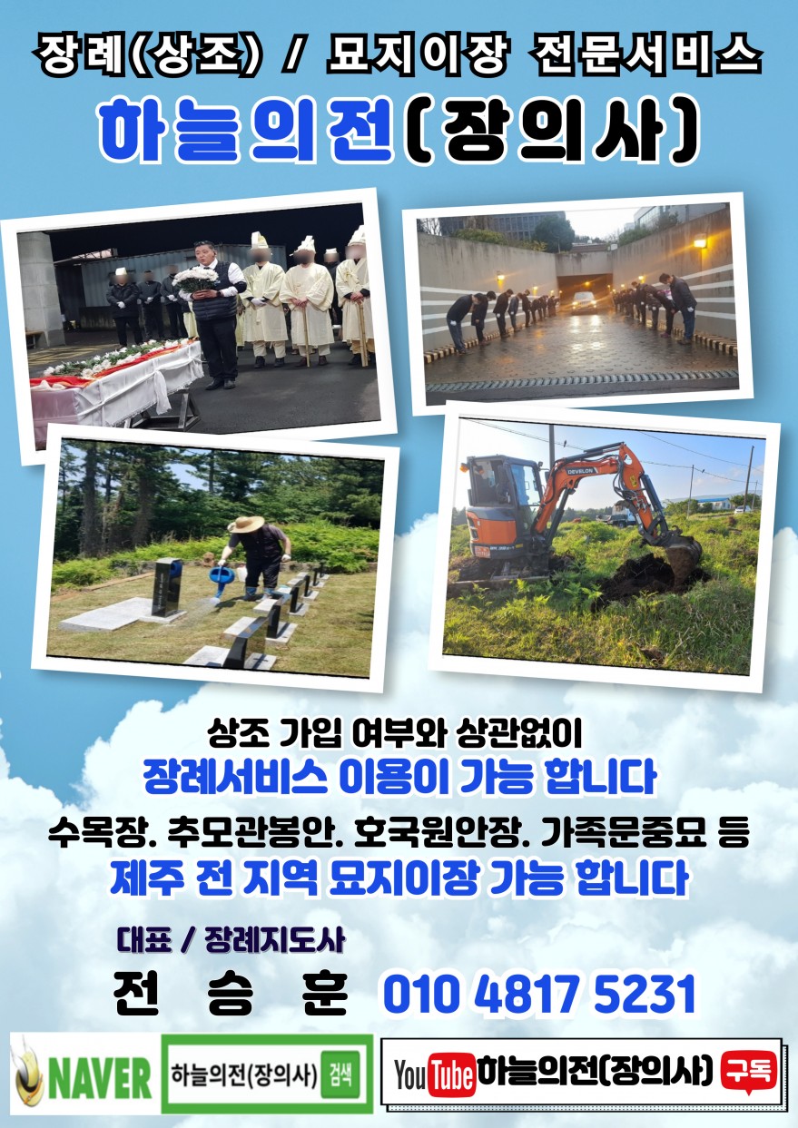 기타 | ★★ 제주도 묘지이장이 고민이라면? 여기로 하자!! ★★ 페이지 정보 작성자 하OO전 작성일25-05-28 10:22 조회4,475회 연락처 010-4817-5231 관련링크 본문 제주도 묘지이장 전문제주후불상조 하늘의전(장의사) 입니다.묘지이장 장례상담 언제든지가능!택일부터 마무리까지 한번에!! 이전글 다음글 목록