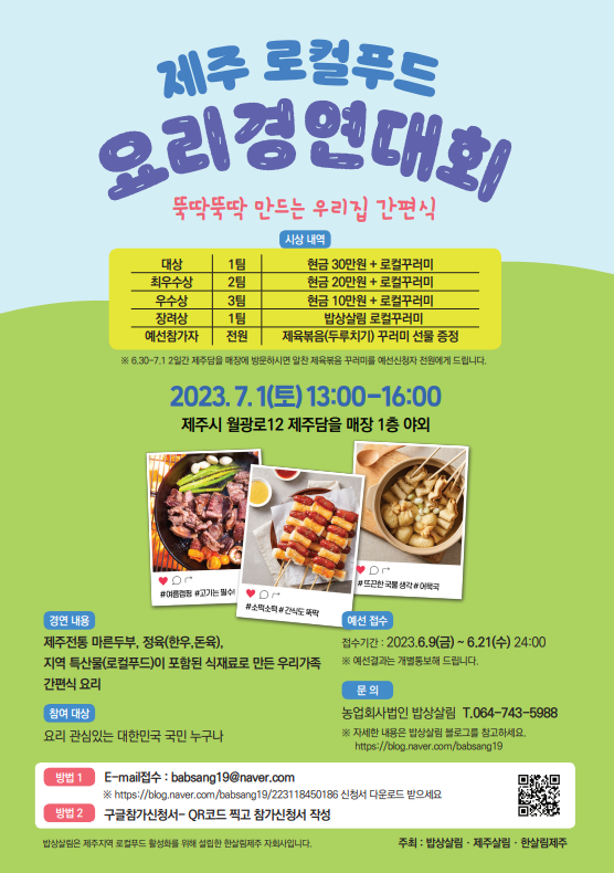 기타 | 제주 로컬푸드 경연대회 7월1일 개최합니다. 페이지 정보 작성자 sOOOOOo 작성일23-06-14 13:11 조회7,467회 연락처 010-9224-1979 관련링크 본문 밥상살림이 주최하는 요리경연대회가 7.1(토) 1300-1600 한살림-제주담을 매장에서 개최됩니다. 제주로컬 푸드를 알리고자 하는 좋은 취지의 대회입니다. 많은 참여 부탁드립니다. 문의는 064-743-5988.. 이전글 다음글 목록