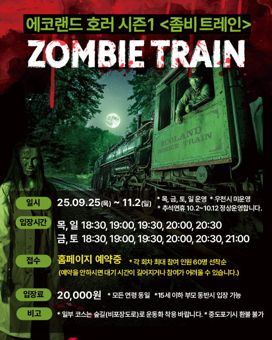 좀비의 추격을 따돌려라!! 에코랜드로 오세요!! 페이지 정보 작성자 고O준 작성일25-09-04 17:22 조회1,153회 연락처 010-9783-1542 관련링크 본문 좀비와 숨 막히는 추격전!! 에코랜드로 오세요!! 사전예약 오픈!!! *인터넷에서 에코랜드 테마파크 검색 후 예매 가능합니다! 이전글 다음글 목록
