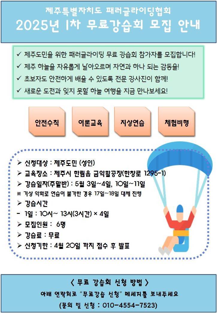 패러글라이딩 무료강습회 안내 페이지 정보 작성자 제OOOOOOOOO회 작성일25-04-07 12:26 조회4,028회 연락처 010-4554-7523 관련링크 본문 제주특별자치도 패러글라이딩협회는 제주도민을 대상으로 무료강습회를 실시 합니다. 안전하고 재미있게 패러글라이딩을 배울수 있게 도와드리며 강사와 함께 체험비행을 하며 직접 조종까지 할 수 있는 교육을 진햇 하오니 제주도민분들의 많은 신청 바랍니다. ※ 자세한 내용은 사진참고 이전글 다음글 목록