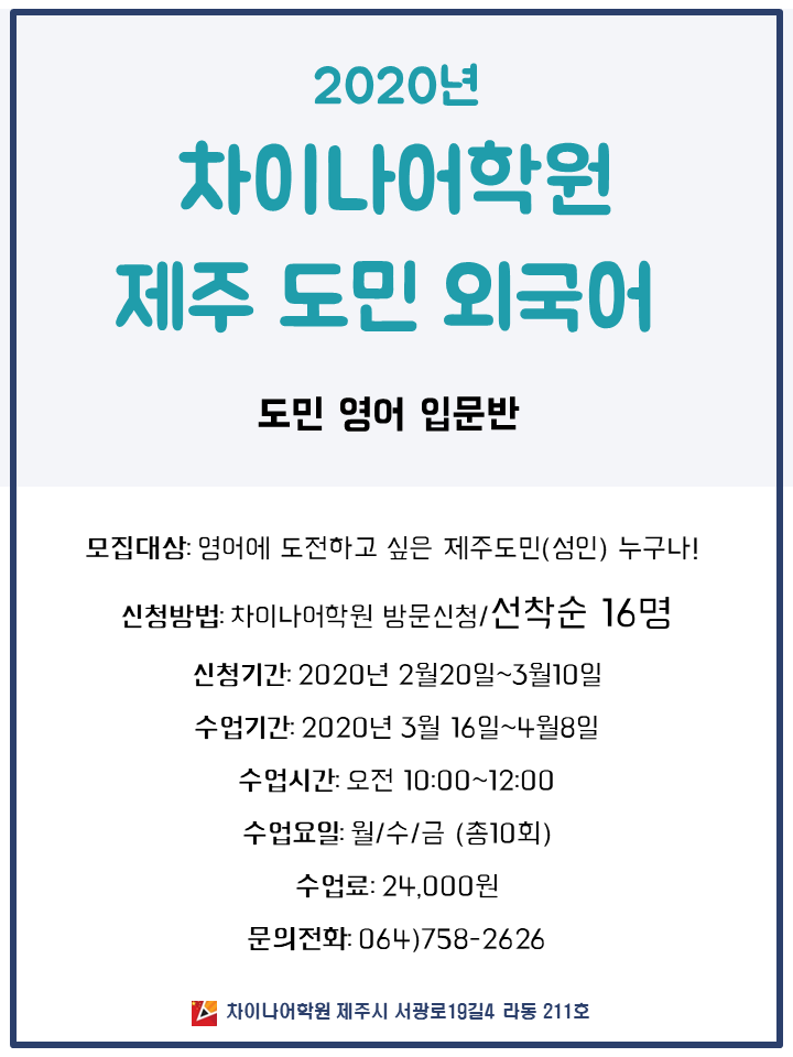 도민외국어 <영어 입문반> 개강안내 페이지 정보 작성자 제OOOOOO원 작성일20-02-19 18:05 조회7,166회 연락처 010-4143-1340 관련링크 본문 2020년 도민외국어 <영어 입문반> 개강안내접수기간: 2월20일~3월10일 (선착순16명)개강날짜: 2020년 3월 16일접수문의: 차이나어학원 064)758-2626 이전글 다음글 목록