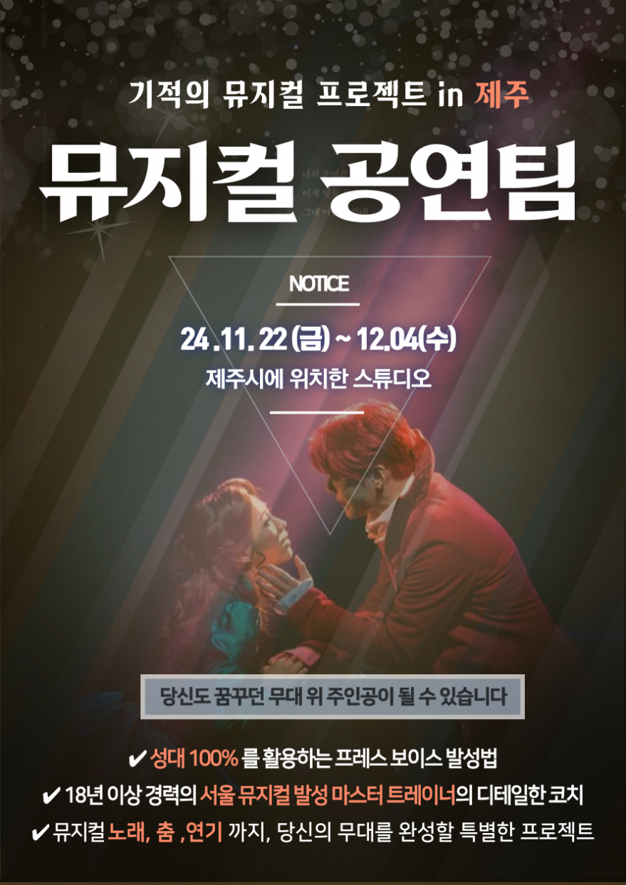 [제주] 제주에서 진행되는 특별한 뮤지컬 공연팀 프로젝트 페이지 정보 작성자 sOOOOOOO6 작성일24-11-23 02:15 조회6,116회 연락처 010-8248-7626 관련링크 본문 이전글 다음글 목록