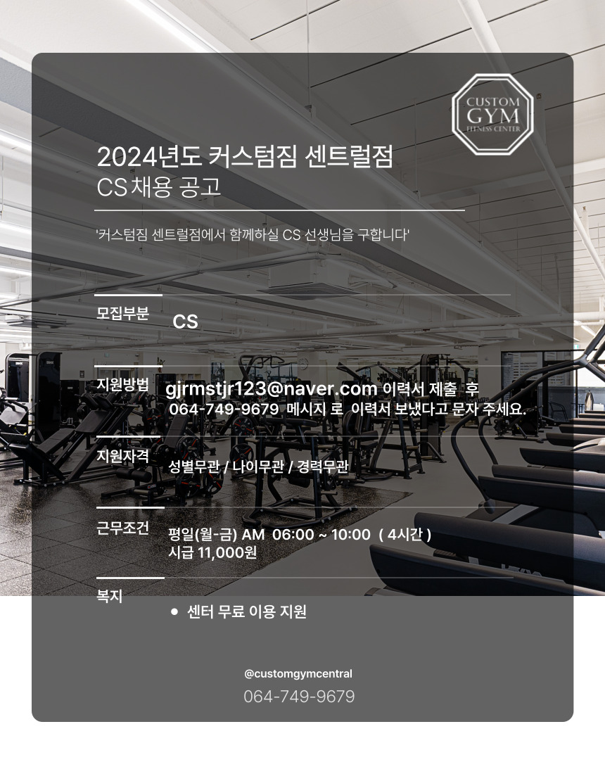커스텀짐센트럴점에서 새롭게 함께하실 선생님을 구합니다 페이지 정보 작성자 안O영 작성일24-06-17 21:18 조회5,062회 연락처 010-5519-7343 관련링크 본문 안녕하세요:)커스텀짐센트럴점입니다. 이력서 제출1. 메일로 이력서 보내주세요.2. 064-749-9679 문자로 이력서 보냈다고 문자 주세요. 많은 관심부탁드려요.주소 : 제주특별자치도 제주시 1100로 3324 3, 4층 커스텀짐 센트럴점 3층 이전글 다음글 목록