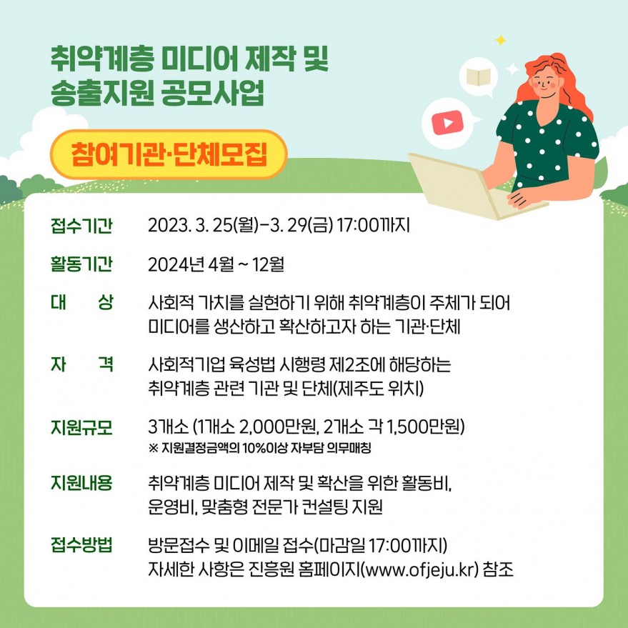 - 지원대상 : 사회적 가치 실현을 위해 제주를 기반으로 취약계층이 주체가 되어 미디어를 생산하고 확산하고자 하는 기관 및 단체