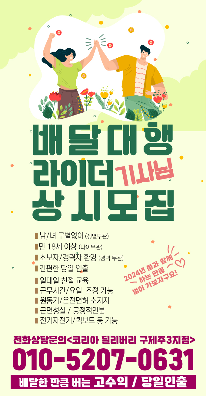 ★★★[구제주]코리아딜리버리/배달/라이더/기사님/모집[남녀구분없이]★★★ 페이지 정보 작성자 배달 작성일24-03-04 21:23 조회5,129회 연락처 010-5207-0631 관련링크 본문 [구제주] 에서 함께 배달일 할 기사님 모집합니다.성별 상관없이 초보자도 가능하니 편하게 연락하고상담 받아 보세요 이전글 다음글 목록