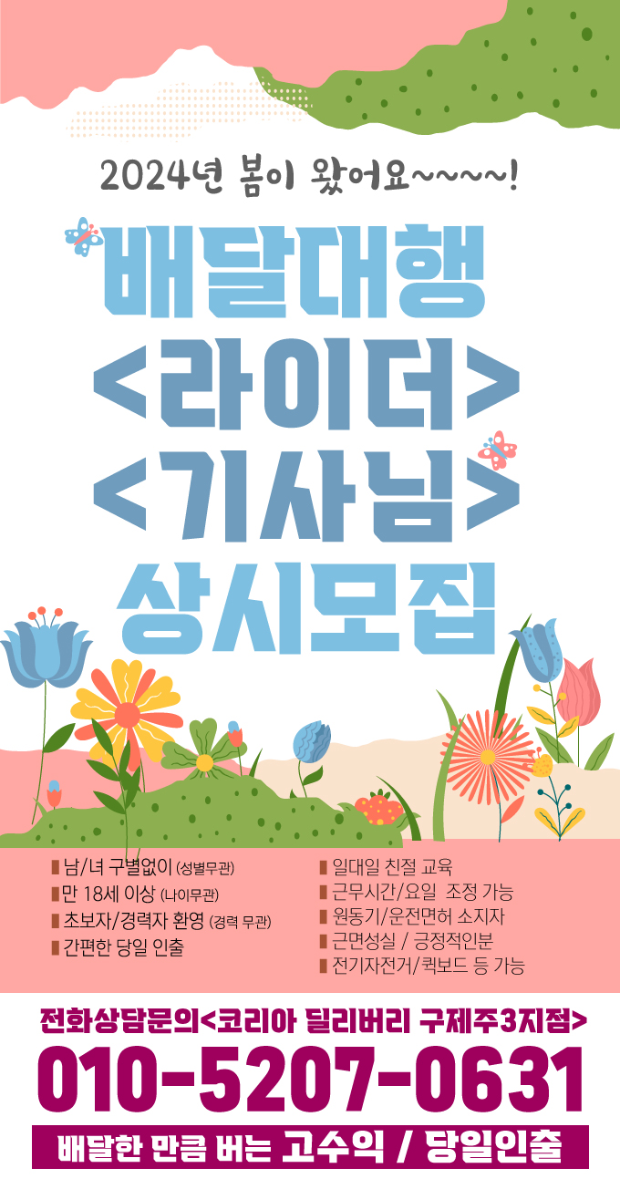 ★★★[구제주]코리아딜리버리/배달/라이더/기사님/모집[남녀구분없이]★★★ 페이지 정보 작성자 코OOOOO리 작성일24-02-22 14:36 조회5,126회 연락처 010-5207-0631 관련링크 본문 [구제주] 에서 함께 배달일 할 기사님 모집합니다.성별 상관없이 초보자도 가능하니 편하게 연락하고상담 받아 보세요 이전글 다음글 목록