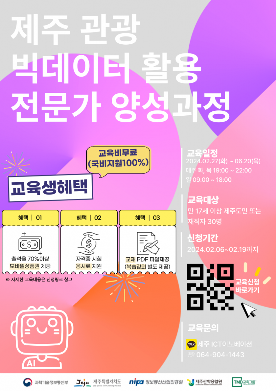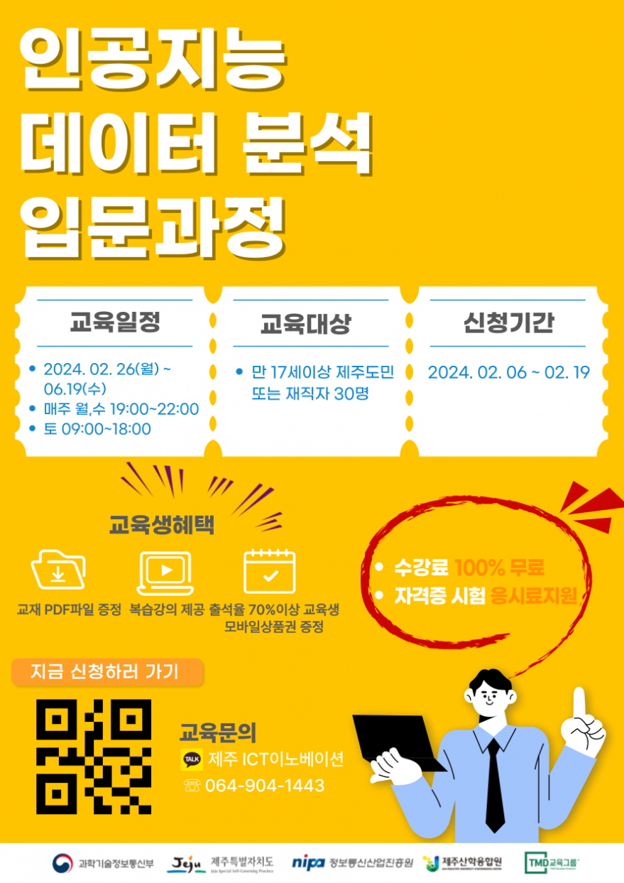 [무료교육] 인공지능, 데이터 분야 교육생 모집 페이지 정보 작성자 제OOOOOOOO국 작성일24-02-07 16:28 조회4,621회 연락처 010-5509-1301 관련링크 본문 2024 제주 ICT이노베이션 운영사무국입니다.인공지능과 데이터 시대를 주도해, 각 분야의 전문가로 성장할 절호의 기회!지금 바로 교육 신청하세요!상세 내용은 포스터 참고 바랍니다. 이전글 다음글 목록
