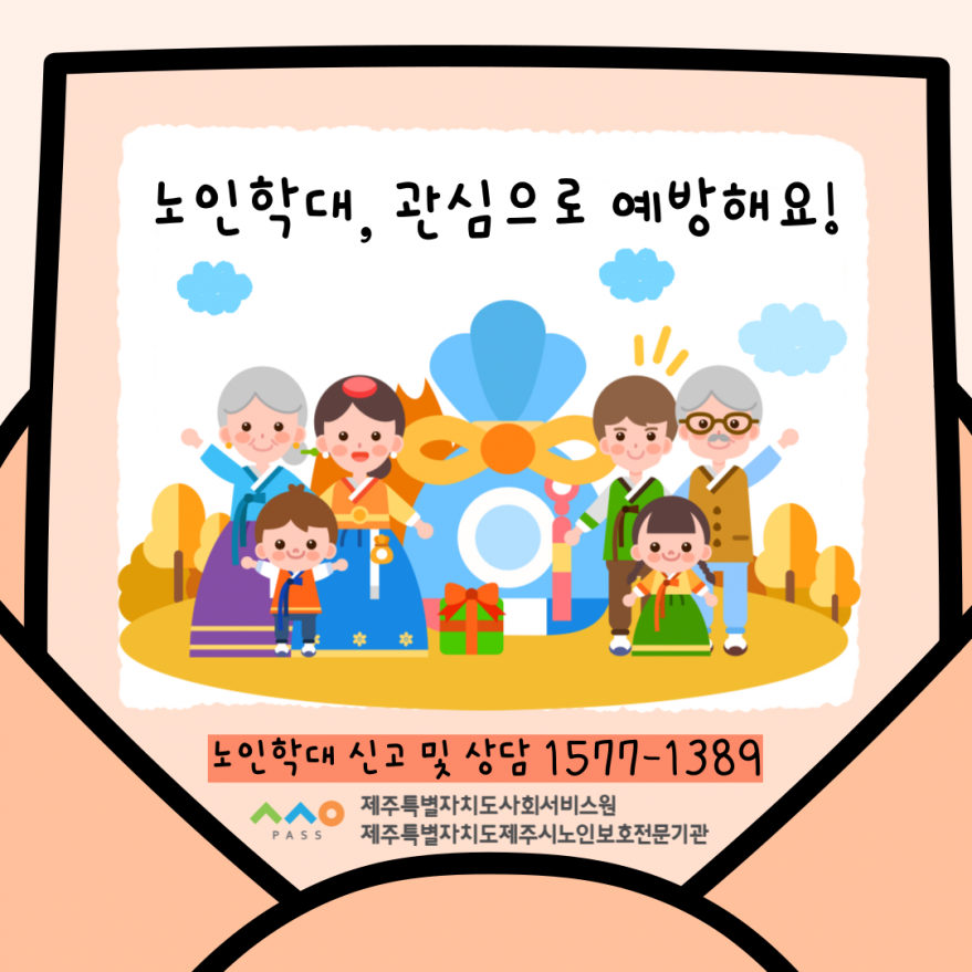 [제주특별자치도제주시노인보호전문기관] 2월 노인학대 예방 포스터 페이지 정보 작성자 제OOOOOOOOO관 작성일24-02-01 13:49 조회4,553회 연락처 010-4690-1389 관련링크 본문 안녕하세요! 제주시노인보호전문기관입니다.2월도 노인학대예방을 위해 많은 관심 부탁드립니다!다가오는 설에도 새해 복 많이 받으세요^.^ 이전글 다음글 목록