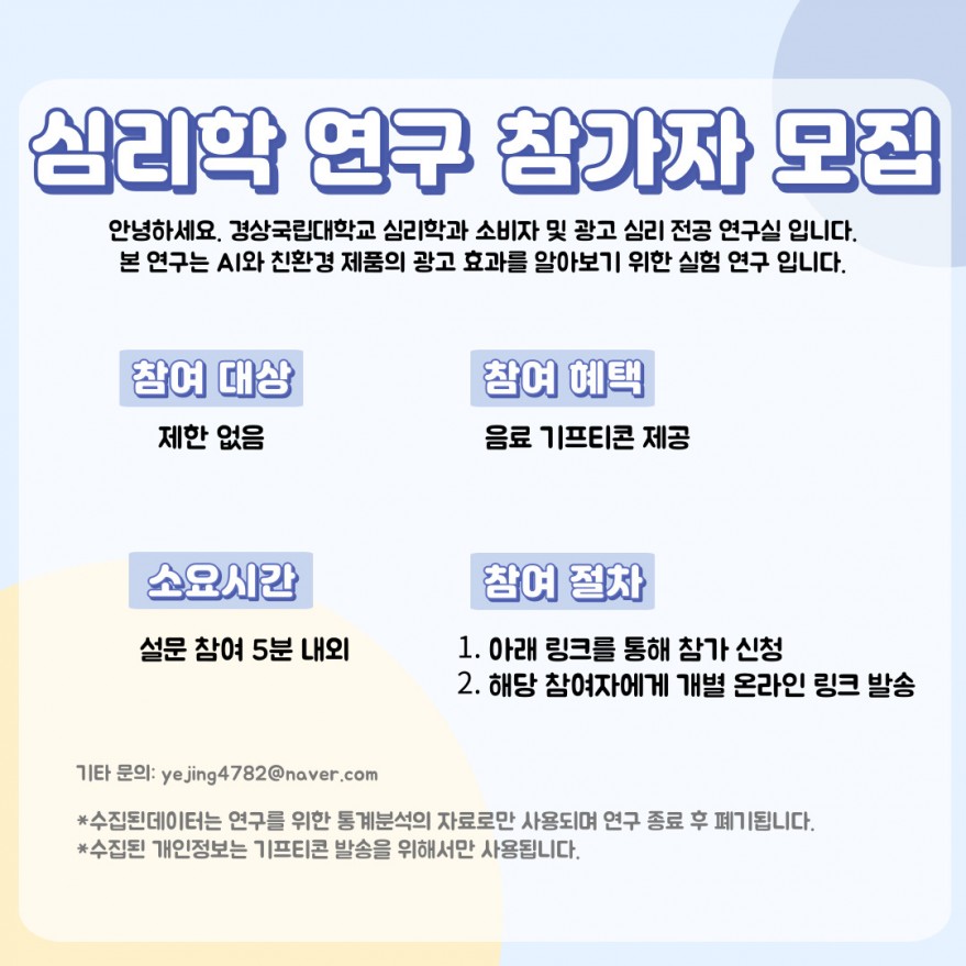 경상국립대 심리학 실험 참가자 모집(음료 기프티콘 증정)!!