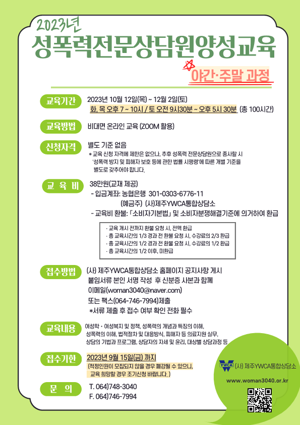 (사)제주YWCA통합상담소에서는 성폭력 피해자 상담 지원을 위한 성폭력전문상담원 양성교육을 실시합니다.
