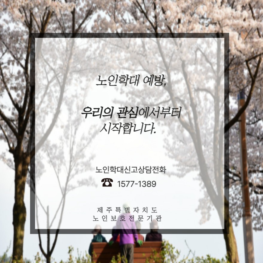 [제주특별자치도노인보호전문기관]노인학대 예방, 우리의 관심에서부터 시작합니다. 페이지 정보 작성자 제OO보 작성일23-05-30 10:12 조회4,619회 연락처 010-0000-0000 관련링크 본문 노인학대 예방, 우리의 관심에서부터 시작합니다. 이전글 다음글 목록