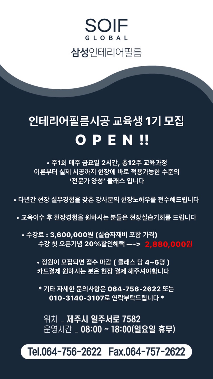 인테리어필름 시공 교육생 모집! 페이지 정보 작성자 삼OOOOOOOOOO판 작성일23-04-18 13:01 조회4,679회 연락처 010-3140-3107 관련링크 본문 삼성인테리어필름 제주 총판에서 필름 시공 클래스를 개설하였습니다.관심있는 분들의 많은 지원 기대합니다. 이전글 다음글 목록