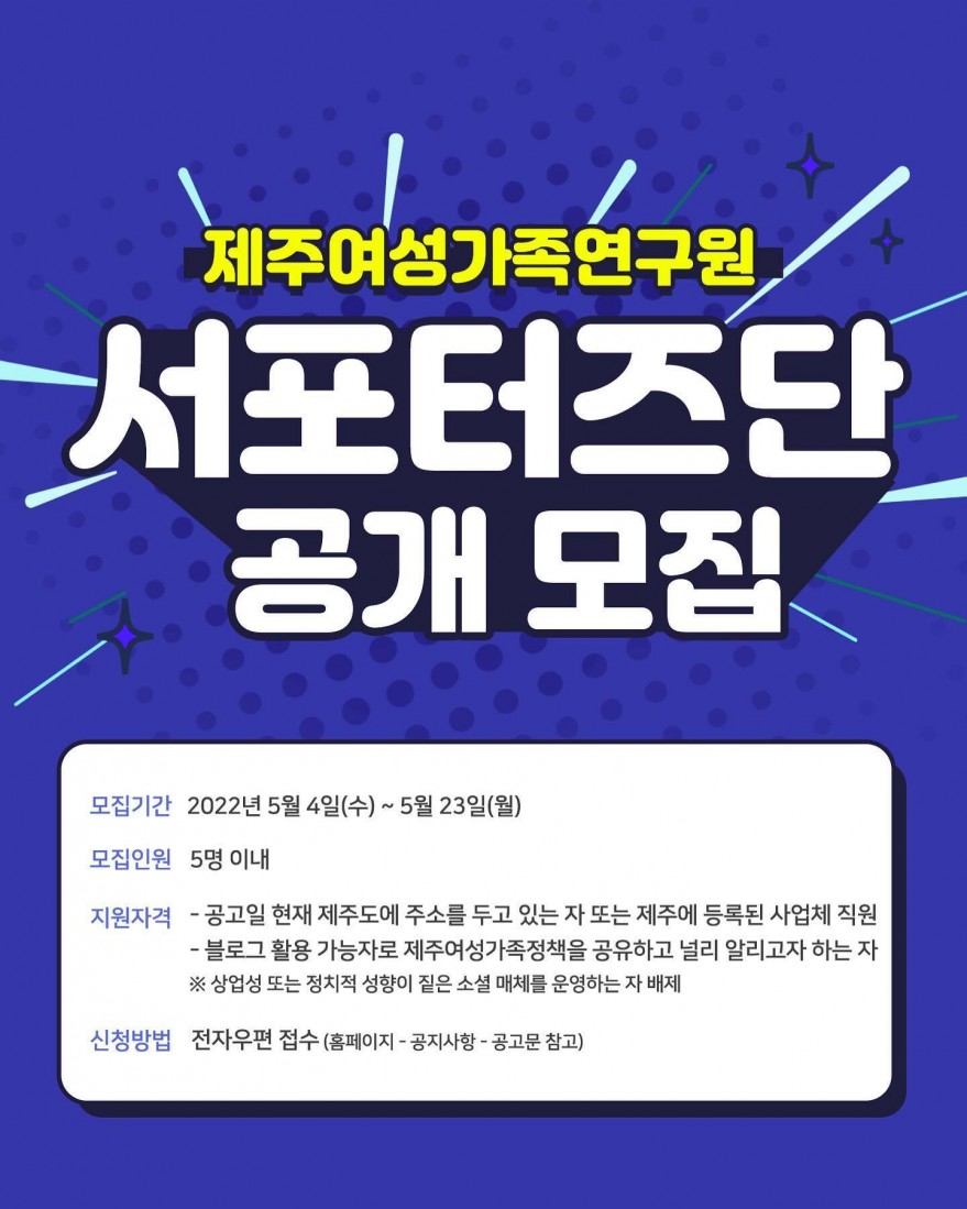 서포터즈 모집과 관려하여 자세한 내용과 신청은 제주여성가족연구원 홈페이지 공지사항에서 확인하세요 :)