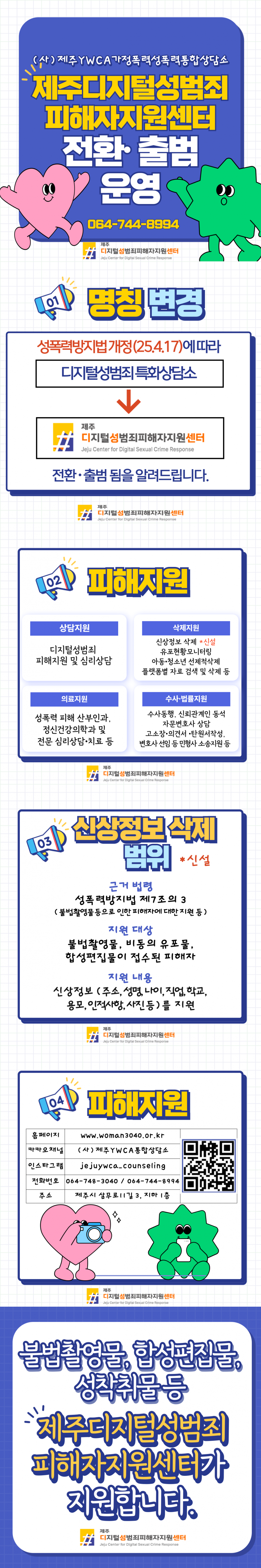 제주디지털성범죄피해자지원센터 전환ㆍ출범 페이지 정보 작성자 제OOOOOOOOOOOOOOO소 작성일25-04-25 10:08 조회3,580회 연락처 010-000-000 관련링크 본문 성폭력방지법 개정(25.4.17.)에 따라 제주디지털성범죄피해자지원센터로 전환출범됩니다. 이전글 다음글 목록